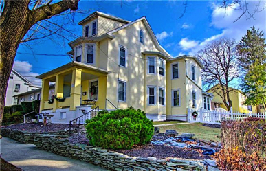 Two family craftsman style stone facade home on corner lot in quaint Victorian Village of Milford, Pa. Main level features 3 bedrooms , two baths, sunken living room and light and airy enclosed sun porch. Hardwood and softwood floors. Beamed ceiling. Gas fireplace. Basement and one car detached garage.